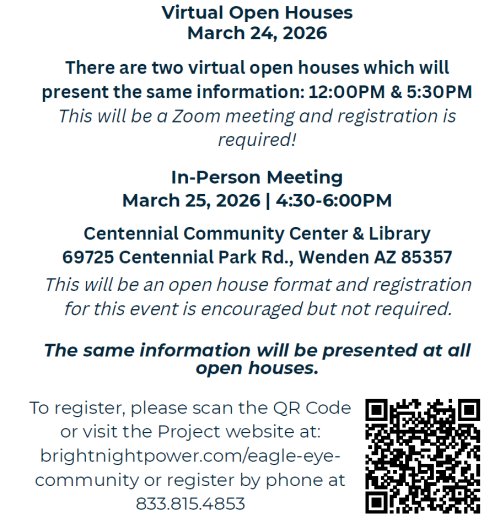 We’re excited to bring the Eagle Eye Energy Center to the La Paz County community and will continue to update this page with the most current information on local meetings and project developments. In the meantime, you can always talk with a member of our Eagle Eye team. Whether you have a question, concern, or suggestion, we want to hear from you!